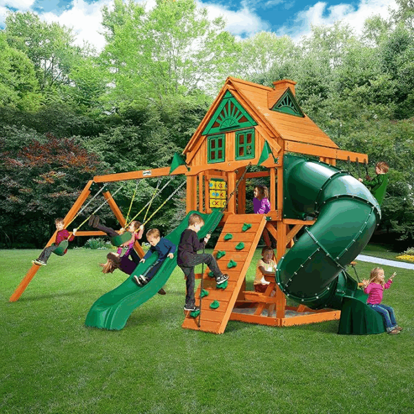 The Gorilla Playsets Mountaineer Treehouse Cedar Swing Set offers a variety of exciting play activities that kids will love, including
