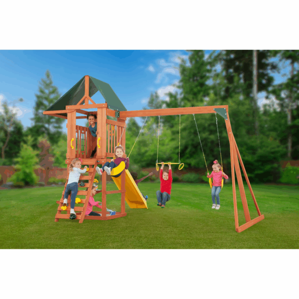 The Congo Monkey Playsystem Adventurer Wooden Swing Set is a premium, ready-to-assemble swing set made from WoodGuard lumber, which is